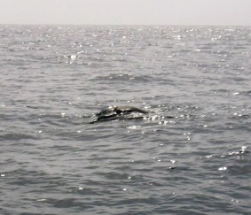 Dopo un po’che vaghiamo nel mare omanita, vediamo una grande massa indistinta e tondeggiante che sbuca in superficie, ad una trentina di metri da noi. E’ qualcosa di semi-sommerso, scuro e lucente, che ondeggia placidamente tra le onde. Grido, indico, il barcaiolo non capisce l’inglese, ma è sveglio, rallenta. Aguzziamo la vista. A me sembra la testa di un globicefalo: li ho già visti, e a volte in effetti stanno così, con la testa a melone che sbuca parzialmente dall’acqua, a farsi dondolare pigramente dalle onde. Ci avviciniamo cautamente con la barca e mi rendo conto che non è la testa di un globicefalo, ma continuo a non capire cosa sia quella massa scura che ondeggia in superficie.