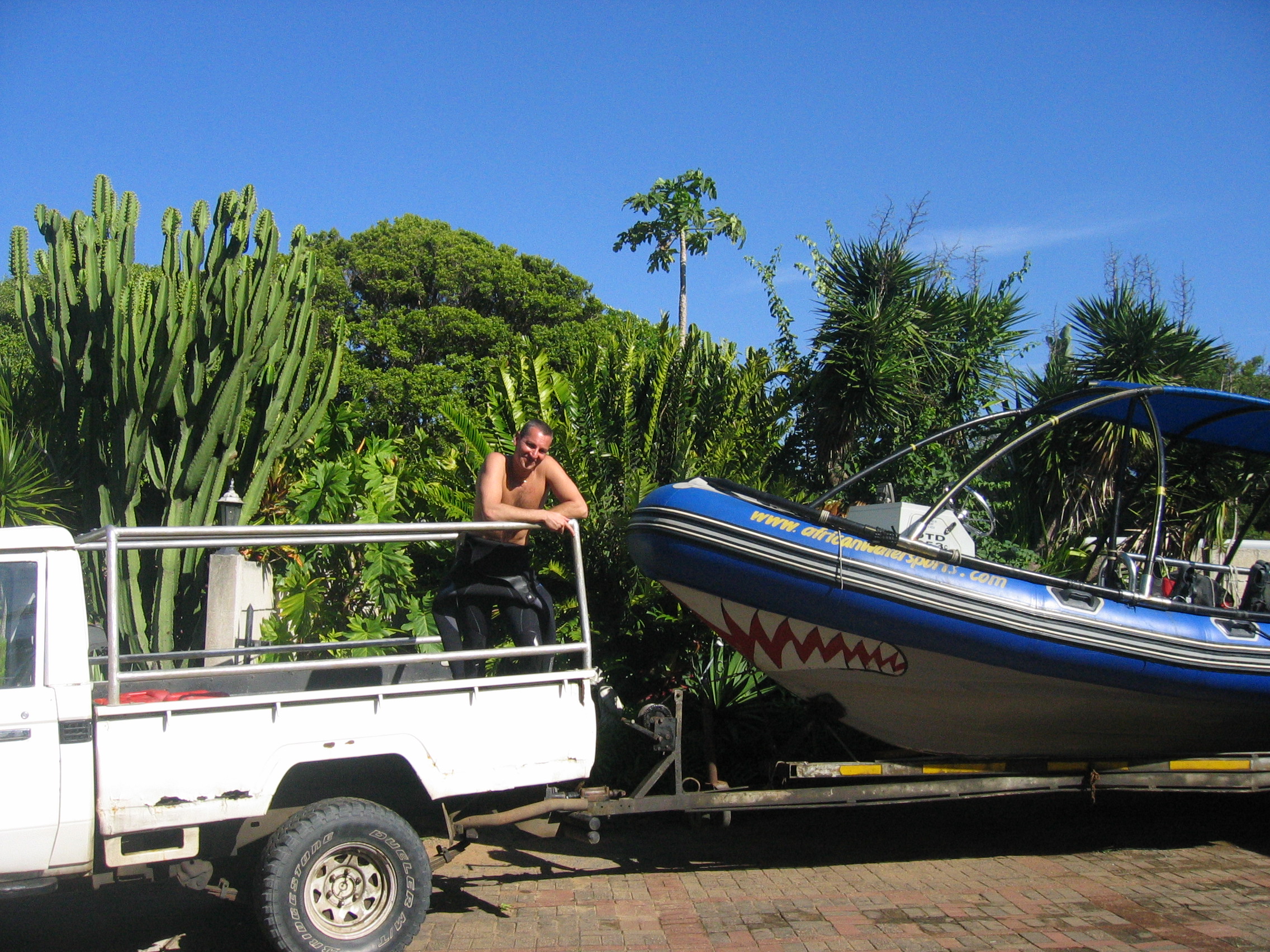 Sono oltre dieci anni che Walter, fondatore e boss di African Watersports, si immerge con i tigre, rigorosamente senza gabbia. Ha ormai le idee chiare: “Lo squalo tigre cerca di collocarvi sulla SUA scala di valutazione: ad un estremo c’è il predatore, all’altro la preda. Se vi identificherà come predatore, scapperà. E non è quello che vogliamo. Se invece vi identificherà come preda, vi attaccherà. Quindi voi dovete confonderlo, stando verticali in acqua e producendo bolle, così lui vi gira intorno per capire cosa siete. In questo modo possiamo osservarlo per bene. Non perdetelo mai di vista: se si avvicina di soppiatto alle spalle può diventare pericoloso. Se si avvicina troppo, urlate nell’erogatore, e vedrete che lui si allontanerà”.