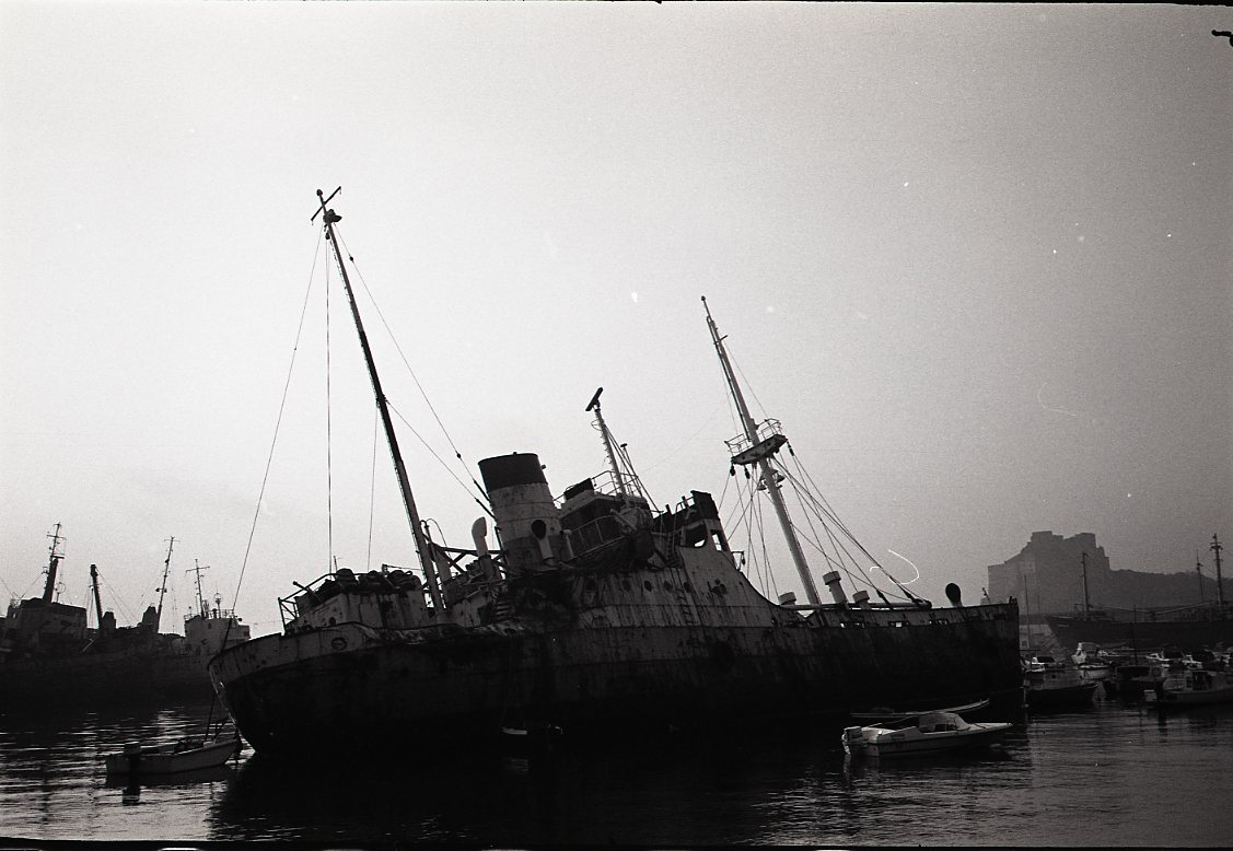 Arrivati al porto, si fa per dire, scarichiamo l’attrezzatura: il serbatoio rosso con tubo e “pompetta” neri, una tanica di carburante supplementare, un paio di borse con panini ed asciugamani. Siamo a Baia, al Cimitero delle navi, un piccolo bacino nel quale vengono arenate le navi in disarmo prima di essere smantellate e rivendute a pezzi. Il risultato è un budello emerso (e sommerso) di prue maestose, murate e timoni mezzi fuori e mezzi dentro l’acqua. Alcune barche sono ormeggiate in mezzo agli scafi, altre, tra queste quella di Zio Gennaro, sono oltre le navi. E’ mattino presto e l’aria è fresca, non si vede nessuno tranne un vecchietto in lontananza che con una remata lenta ma efficiente punta verso di noi. Io nel frattempo sgattaiolo in giro a curiosare e mi imbatto in una gabbia con un uccello enorme, ha un becco ricurvo e lunghi artigli “E’ nu’ falc’ pellegrin, l’amm’ truvat ca scella sp’zzat.” mi apostrofa una signora, poi “Alfonso ! Alfonso!” mi chiamano, si và. Saliamo a bordo del natante del nostro Caronte e dopo qualche minuto trasbordiamo sulla barca di Zio Gennaro. Ci sistemiamo, colleghiamo il serbatoio e partiamo, destinazione Allevamento di cozze di Baia.