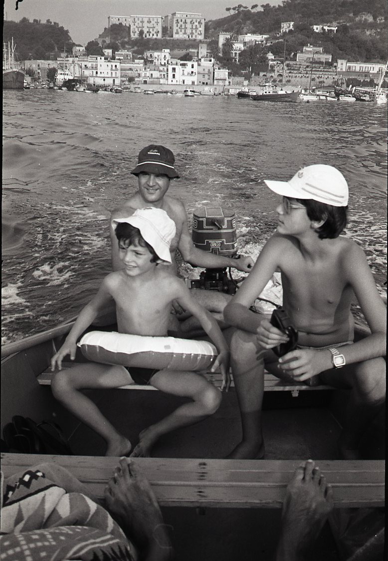 Nel pomeriggio decidiamo che è ora di mettere la prua verso casa. Zio Gennaro afferra la cima dell’ancora ed inizia a salpare, ma l’ancora non si muove. Molla tutta la cima, lascia scarrocciare la barca e riprova, ma niente. Allora mio padre ai remi cerca di variare l’orientamento dalla barca rispetto al punto presunto in cui si trovava l’ancora, ma ancora nulla, sembra saldata al fondo. Dopo circa 30 minuti di tentativi ci decidiamo a tagliare, ma proprio mentre la cima inizia a perdere i propri contorni di nitidezza iniziando ad inabissarsi, mio padre immerge tutto il braccio in acqua, l’afferra e tira! Recupera molto di più della lunghezza del proprio arto e poi ancora di più, l’ancora si era liberata e riusciamo a salparla. “Ci abbiamo rimesso una cima” dice Zio Gennaro, “Si ma meglio la cima che l’ancora!” replica mio padre e scoppiamo tutti a ridere. Zio Gennaro si sposta a poppa posizionandosi davanti al VolvoPenta, agguanta la cima dì avviamento e tira all’indietro. Il risultato è che la mezza cima compresa di maniglia gli rimane in mano, l’altra metà si riavvolge nel motore, come una vipera che colta allo scoperto si affretta a rintanarsi nel primo buco che trova. Incredibile, due sfighe di seguito così non si erano mai viste, ora siamo senza motore. Anche smontando la calotta del Volvo Penta ed avvolgendo la cima residua sul volano non si riesce ad avere abbastanza grip per farlo accendere e dopo qualche tentativo rinunciamo. A quel punto non restano che i remi. Procolo il figlio di Zio Gennaro ed io, siamo fuori gioco, io avevo circa 12 anni e Procolo un paio in meno, zio Gennaro è tachicardico, non resta che mio padre, che essendo cresciuto a Posillipo dove ha trascorso da bambino lunghe estati al mare aveva i remi nel dna. Si posiziona sulla panca, li agguanta ed inizia a vogare spalle a prua voltandosi di tanto in tanto per verificare la presenza di eventuali ostacoli che gli segnalavamo e per controllare la traiettoria. Fa caldo.